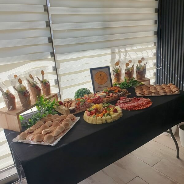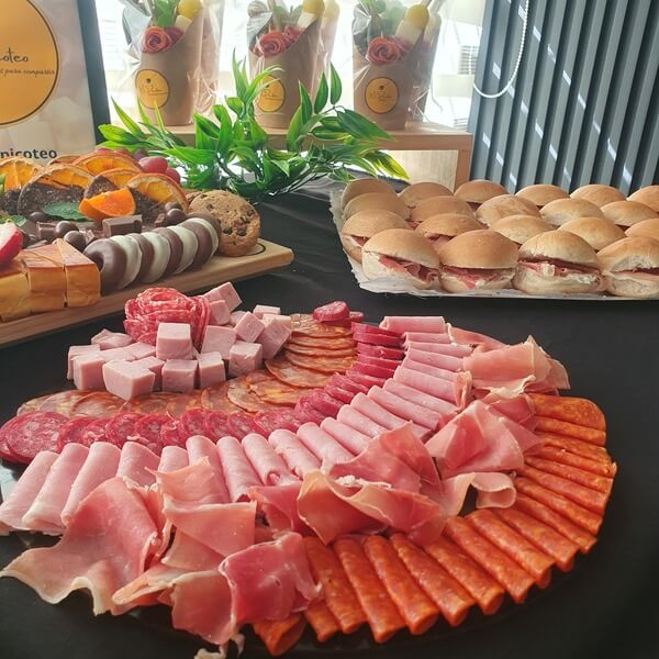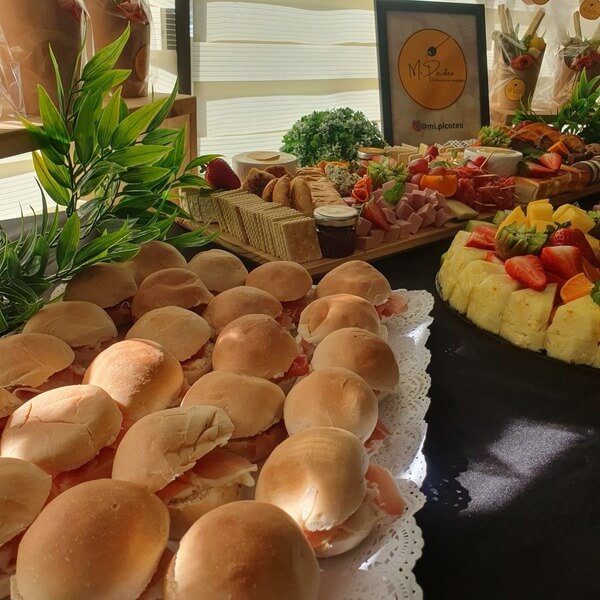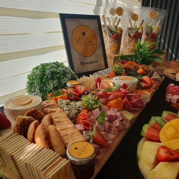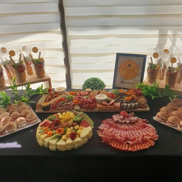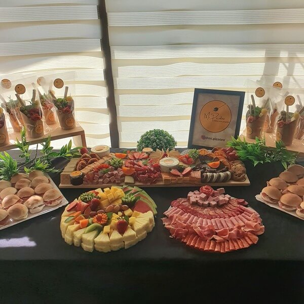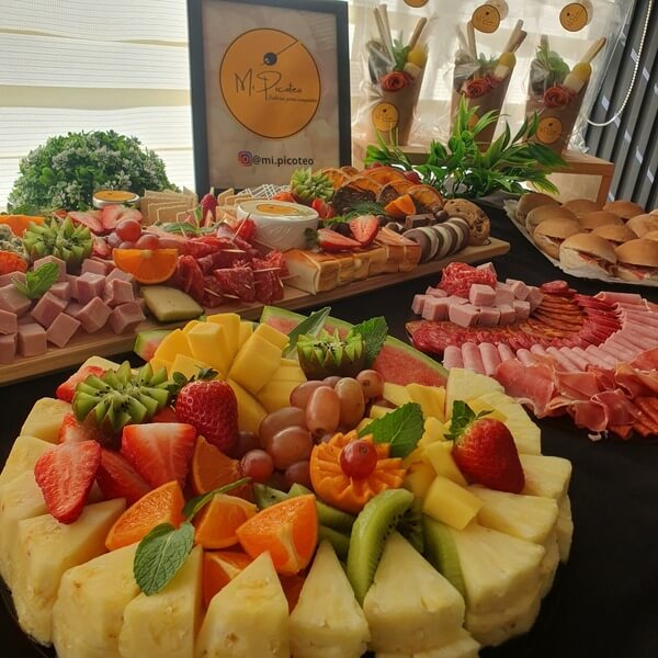 Picoteo Deluxe Mix (12 personas) tabla de 70 cm, Picoteo Mediterráneo (7 personas), 12 Cups (vasos aperitivos), Bandeja de frutas mediana (30 cm), Tapaditos Jamón serrano y queso crema (24 unidades), Tapaditos Ave pimentón lechuga (24 unidades).