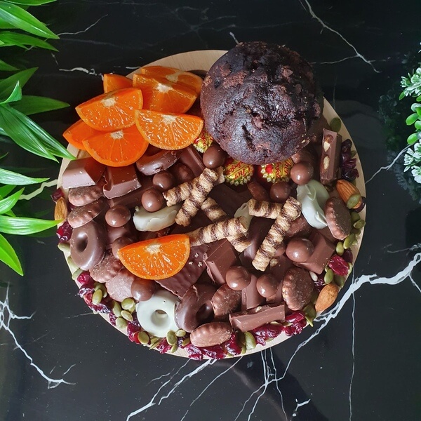 Tabla de 23 cm diametro. Contiene: Bombones cereza al licor, Muffins Chocolate, Chocolate Golden Nuss, Chocolate relleno sabores, Brownie, Galletas morocha, Galletas chocolate negro y blanco, Rolls crispy, Barquillos rellenos, mix de semillas de zapallo, cranberries y almendras, frutas de la estación.